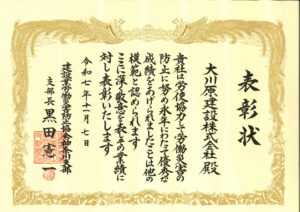 永年にわたって労働災害防止に努めた業績が認められ優良賞(会社)として表彰されました